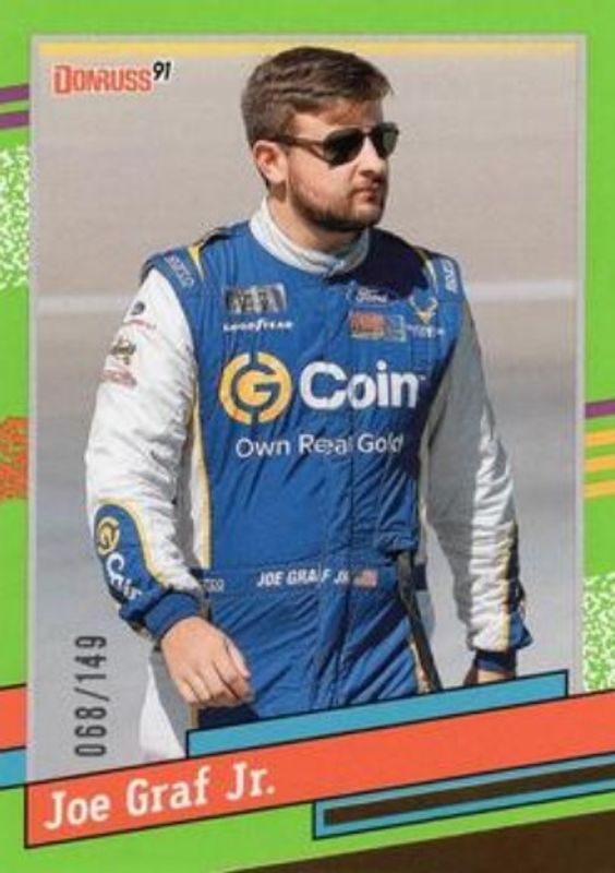 The Joe Graf Jr. 2024 Donruss NASCAR #131 Lime Green /149 card is 1 of 34 Joe Graf Jr.'s card variations in the 2024 Donruss NASCAR set being tracked by Sports Card Investor, including Base, Optic, Optic Black Pandora, Optic Blue Velocity, and Optic Holo.
