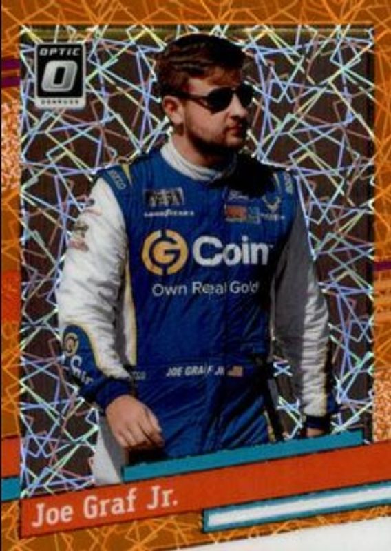 The Joe Graf Jr. 2024 Donruss NASCAR #131 Optic Orange Velocity card is 1 of 34 Joe Graf Jr.'s card variations in the 2024 Donruss NASCAR set being tracked by Sports Card Investor, including Base, Optic, Optic Black Pandora, Optic Blue Velocity, and Optic Holo.