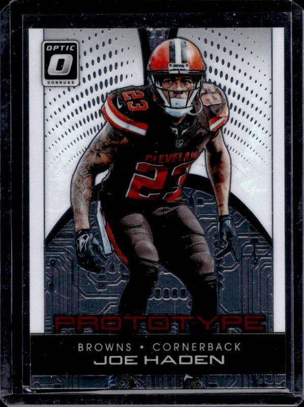 The Joe Haden 2016 Optic #31 Prototypes card is 1 of 11 Joe Haden's card variations in the 2016 Optic set being tracked by Sports Card Investor, including Donruss Threads Blue & - Green, Donruss Threads - Bronze, Donruss Threads - Pink, Prototypes - Blue /149, and Donruss Threads /100.