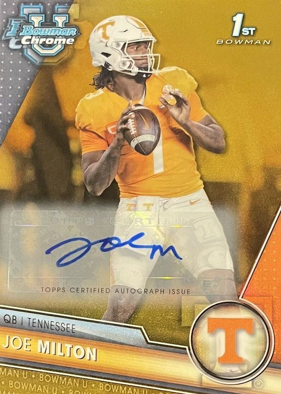 The Joe Milton III 2023 Bowman Chrome University #148 Prospect Auto - Gold Refractor /50 (1st) card in Raw condition has not changed in price in the last 30 days and was last sold for $42.00 .