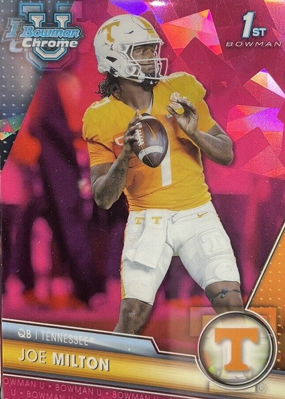 The Joe Milton III 2023 Bowman Chrome University Sapphire Edition #148 Padparadscha /1 (1st) card in Raw condition has not changed in price in the last 30 days and was last sold for $349.99 .