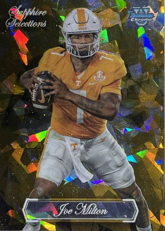 The Joe Milton III 2023 Bowman Chrome University Sapphire Edition #SS-11 Sapphire Selections card in Raw condition has not changed in price in the last 30 days and was last sold for $9.72 .