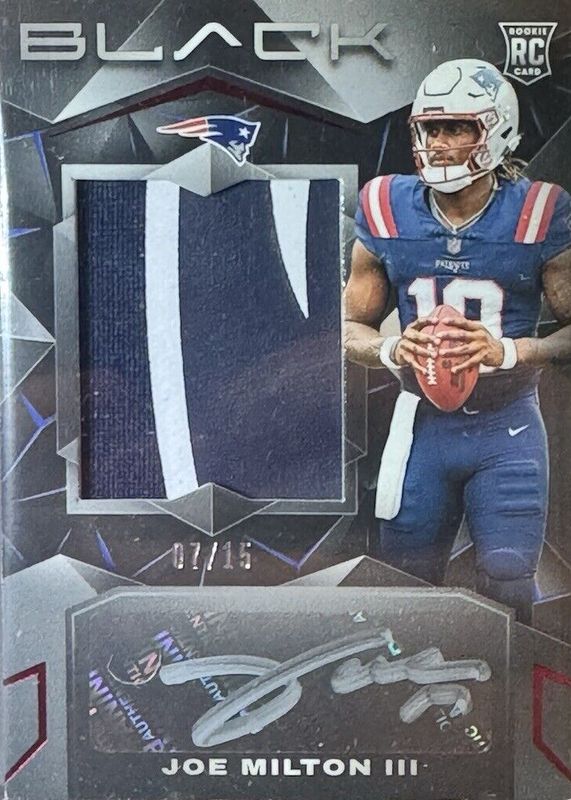 This card is 1 of 17 Joe Milton III's card variations in the 2024 Black set being tracked by Sports Card Investor, including Base, Royal /99, Sapphire /35, Citrine /25, and Emerald /15.