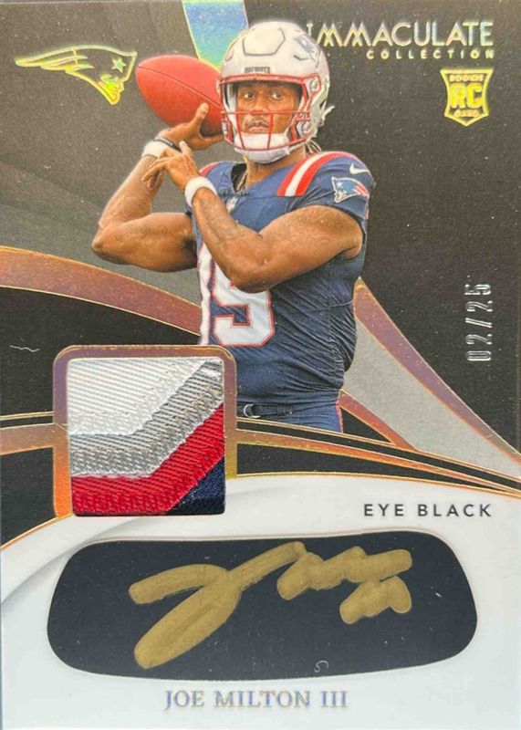 This card is 1 of 23 Joe Milton III's card variations in the 2024 Immaculate set being tracked by Sports Card Investor, including Immaculate Numbers Rookie Patch Autographs /99, Immaculate Rookie Eye Black Jersey /99, Immaculate Rookie Signature Patches /99, Premium Patch Rookie Autographs /99, and Rookie Patch Auto /99.