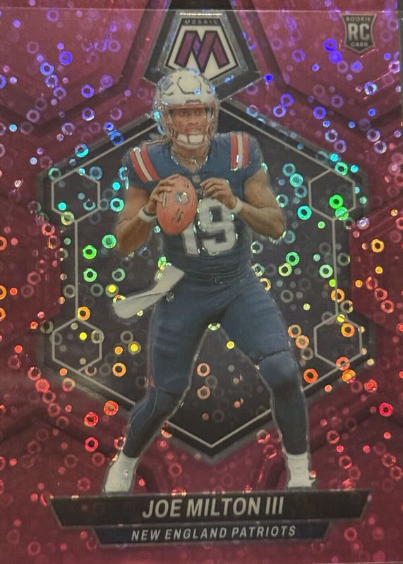 This card is 1 of 42 Joe Milton III's card variations in the 2024 Mosaic set being tracked by Sports Card Investor, including Base, Green, Mosaic, No Huddle, and Pink Camo.