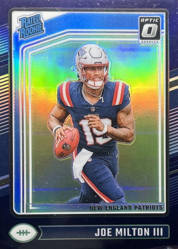 This card is 1 of 72 Joe Milton III's card variations in the 2024 Optic set being tracked by Sports Card Investor, including Base, Blue Hyper, Blue Scope, Green Hyper, and Green Velocity.