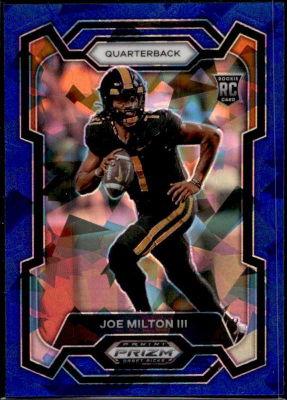 The Joe Milton III 2024 Prizm Draft Picks #157 Blue Ice /99 Rookie card is 1 of 177 Joe Milton III's card variations in the 2024 Prizm Draft Picks set being tracked by Sports Card Investor, including Base, Green, Purple Wave, Red Ice, and Ruby Wave.