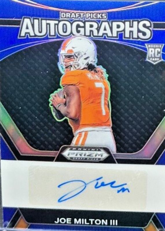 The Joe Milton III 2024 Prizm Draft Picks #DPA-JMN Draft Picks Autographs - Blue /149 Rookie card in Raw condition has not changed in price in the last 30 days and was last sold for $34.80 .