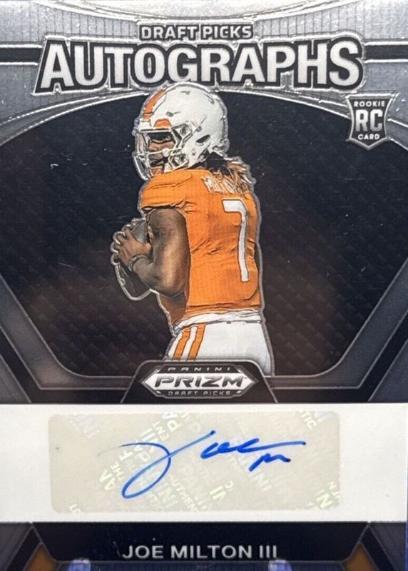 The Joe Milton III 2024 Prizm Draft Picks #DPA-JMN Draft Picks Autographs Rookie card in Raw condition has not changed in price in the last 30 days and was last sold for $8.50 .