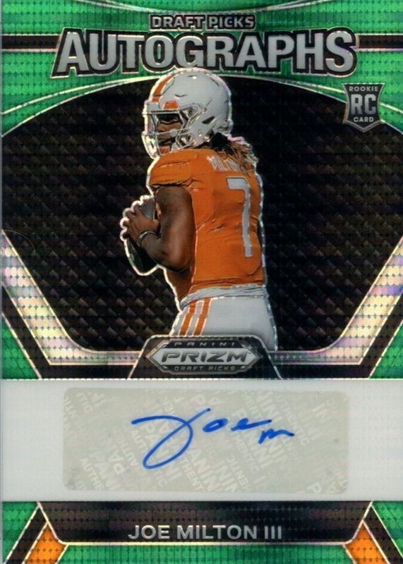 The Joe Milton III 2024 Prizm Draft Picks #DPA-JMN Draft Picks Autographs - Green Pulsar (/25) Rookie card in Raw condition has not changed in price in the last 30 days and was last sold for $32.00 .