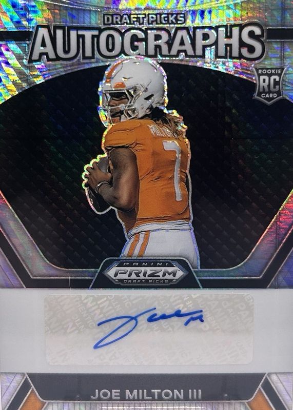 The Joe Milton III 2024 Prizm Draft Picks #DPA-JMN Draft Picks Autographs - Hyper Rookie card in Raw condition has not changed in price in the last 30 days and was last sold for $13.50 .