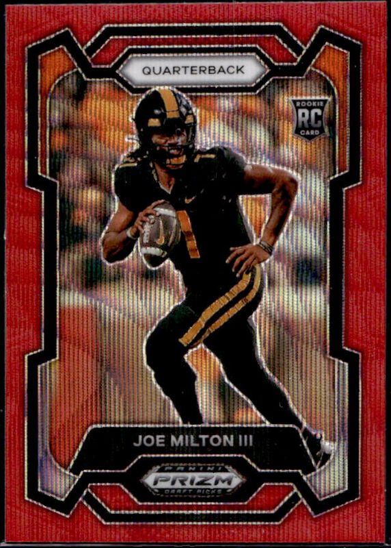 The Joe Milton III 2024 Prizm Draft Picks #157 Ruby Wave Rookie card is 1 of 177 Joe Milton III's card variations in the 2024 Prizm Draft Picks set being tracked by Sports Card Investor, including Base, Green, Purple Wave, Red Ice, and Silver.