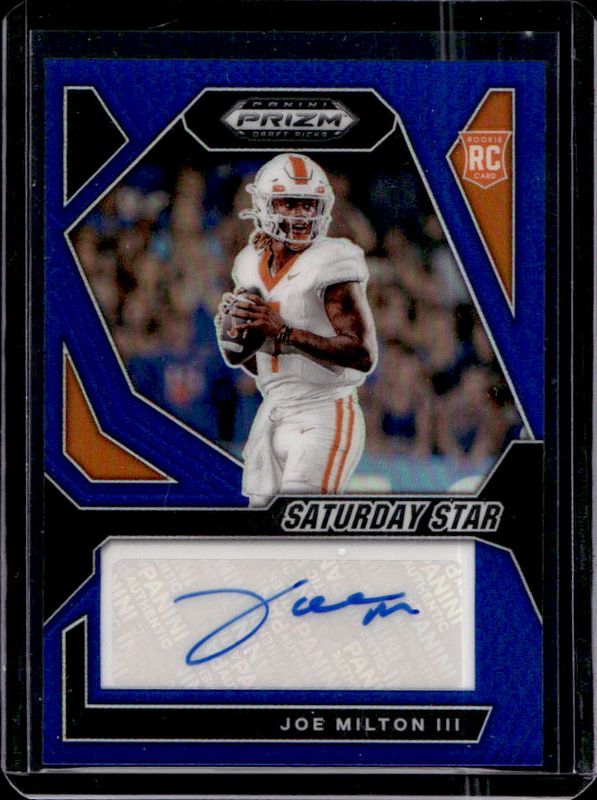 The Joe Milton III 2024 Prizm Draft Picks #SSS-JMN Saturday Star Signatures - Blue /149 Rookie card is 1 of 177 Joe Milton III's card variations in the 2024 Prizm Draft Picks set being tracked by Sports Card Investor, including Base, Green, Purple Wave, Red Ice, and Ruby Wave.