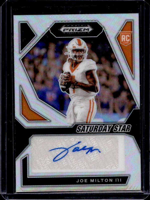 The Joe Milton III 2024 Prizm Draft Picks #SSS-JMN Saturday Star Signatures - Silver Rookie card is 1 of 177 Joe Milton III's card variations in the 2024 Prizm Draft Picks set being tracked by Sports Card Investor, including Base, Green, Purple Wave, Red Ice, and Ruby Wave.