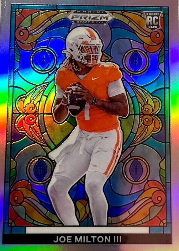 The Joe Milton III 2024 Prizm Draft Picks #SG-JMN Stained Glass /(SSP) Rookie card in Raw condition has not changed in price in the last 30 days and was last sold for $79.00 .