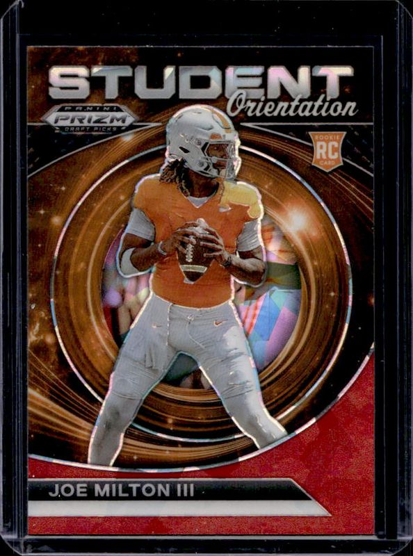 The Joe Milton III 2024 Prizm Draft Picks #SO-JM Student Orientation - Red Ice Rookie card is 1 of 177 Joe Milton III's card variations in the 2024 Prizm Draft Picks set being tracked by Sports Card Investor, including Base, Green, Purple Wave, Red Ice, and Ruby Wave.