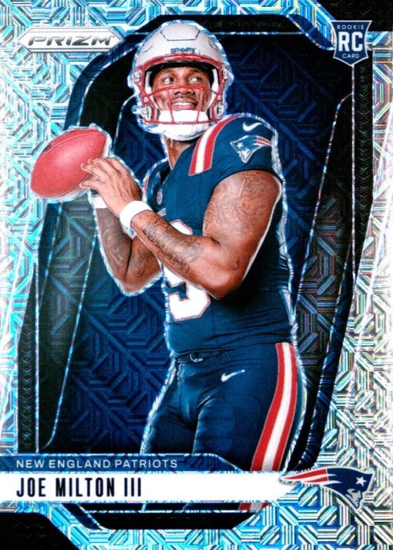 The Joe Milton III 2024 Prizm #20 Rookie Variation - Mojo /25 card in Raw condition has not changed in price in the last 30 days and was last sold for $262.70 .
