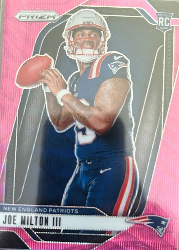 The Joe Milton III 2024 Prizm #20 Rookie Variation - Pink Wave card in Raw condition has not changed in price in the last 30 days and was last sold for $17.00 .