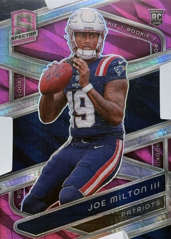 The Joe Milton III 2024 Spectra #156 Neon Pink Die-Cut /20 Rookie card in Raw condition has not changed in price in the last 30 days and was last sold for $64.57 .