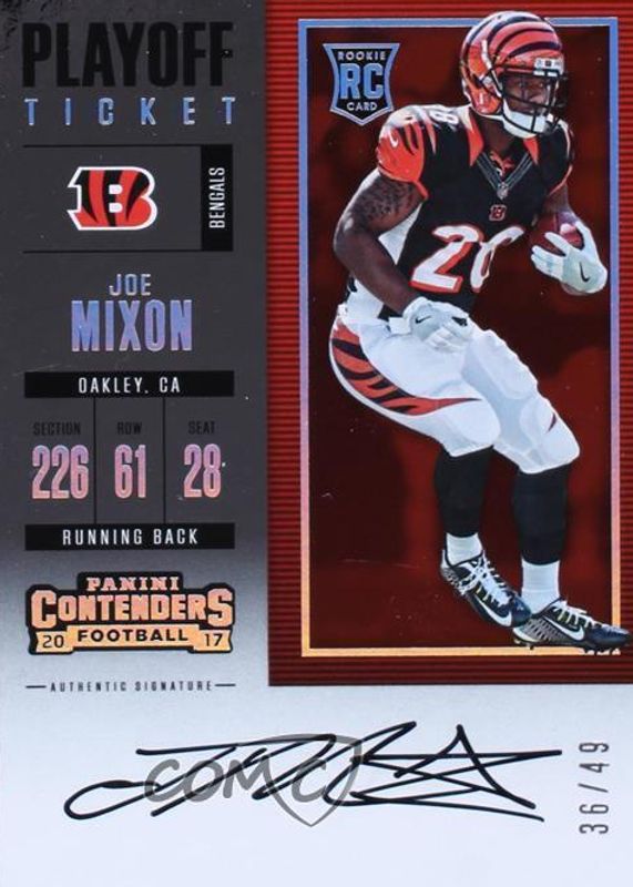 This card is 1 of 11 Joe Mixon's card variations in the 2017 Contenders set being tracked by Sports Card Investor, including Rookie Ticket Auto, Rookie Ticket Auto Variation, Rookie Ticket Auto - Championship Ticket (/25), Rookie Ticket Auto - Red Zone Ticket, and Rookie Ticket Auto Variation - Championship Ticket (/5).