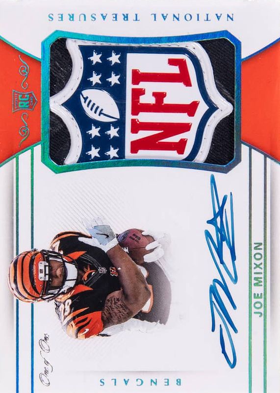 This card is 1 of 11 Joe Mixon's card variations in the 2017 National Treasures set being tracked by Sports Card Investor, including Rookie Patch Auto - Green Jersey Number (/28), Rookie Patch Auto /99, Rookie Patch Auto - Holo Silver /25, The Future Signatures /25, and Rookie Patch Auto - Stars & Stripes /13.