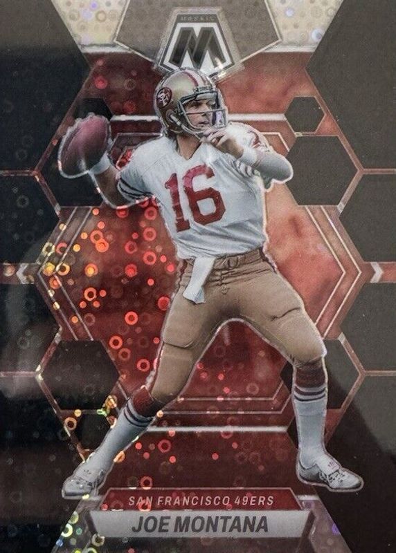 This card is 1 of 8 Joe Montana's card variations in the 2023 Mosaic set being tracked by Sports Card Investor, including Choice Peacock /(SSP), Genesis /(SSP), Honeycomb /(SSP), White Sparkle /(SSP), and No Huddle Gold /10.