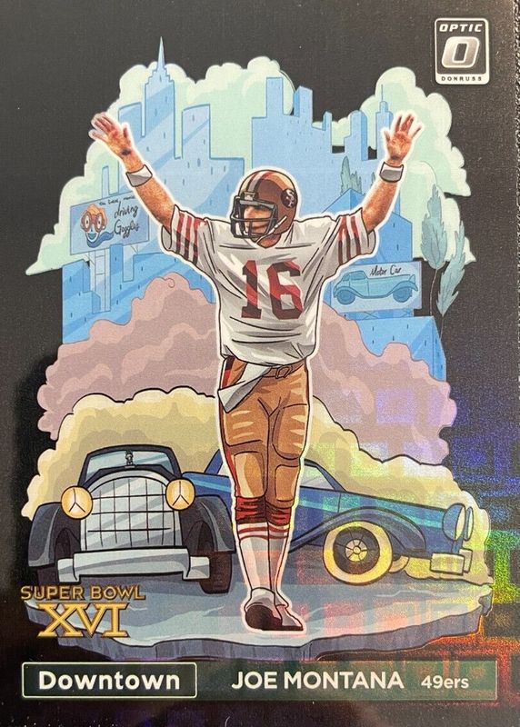 This card is 1 of 5 Joe Montana's card variations in the 2023 Optic set being tracked by Sports Card Investor, including Downtown /(SSP), Downtown - Gold /10, Downtown - Gold Vinyl /1, and Downtown - White Sparkle /1.