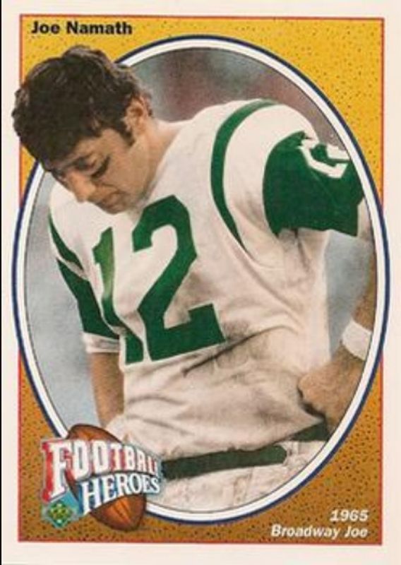 The Joe Namath 1991 Upper Deck #11 Football Heroes: Joe Namath card is 1 of 11 Joe Namath's card variations in the 1991 Upper Deck set being tracked by Sports Card Investor, including #18 Football Heroes: Joe Namath, #16 Football Heroes: Joe Namath, #17 Football Heroes: Joe Namath, #10 Football Heroes: Joe Namath, and #12 Football Heroes: Joe Namath.