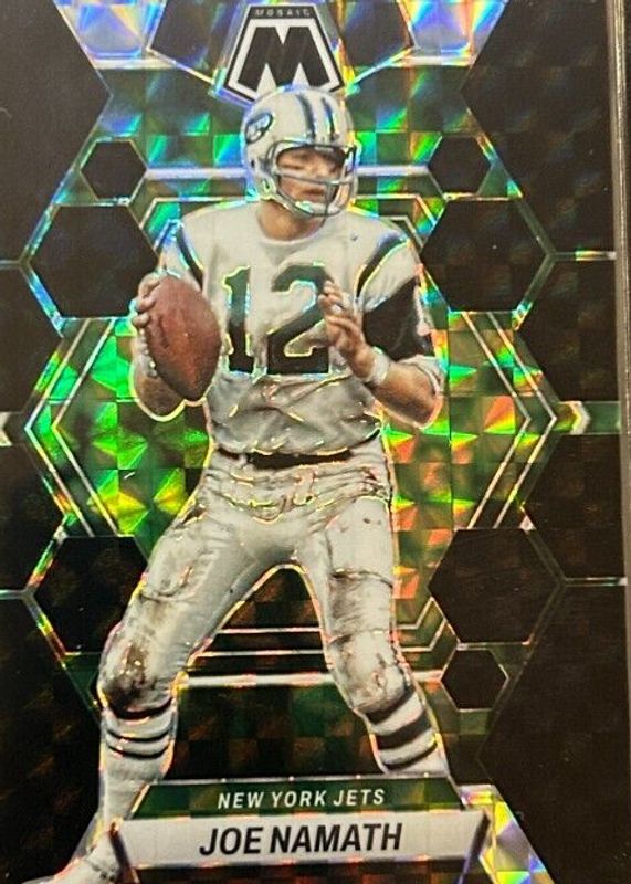 This card is 1 of 8 Joe Namath's card variations in the 2023 Mosaic set being tracked by Sports Card Investor, including Choice Peacock /(SSP), Genesis /(SSP), Honeycomb /(SSP), White Sparkle /(SSP), and No Huddle Gold /10.