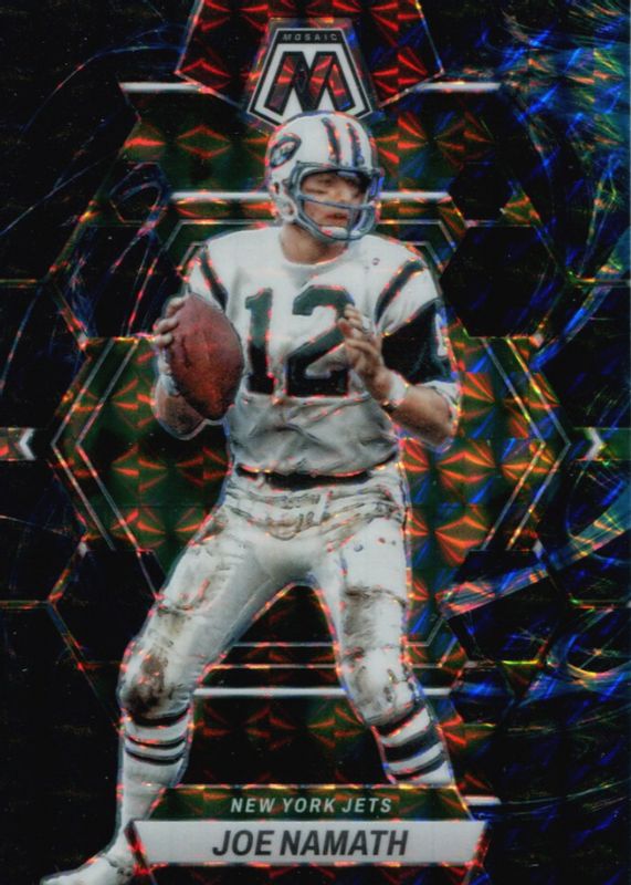 This card is 1 of 8 Joe Namath's card variations in the 2023 Mosaic set being tracked by Sports Card Investor, including Choice Peacock /(SSP), Honeycomb /(SSP), White Sparkle /(SSP), No Huddle Gold /10, and Black /1.