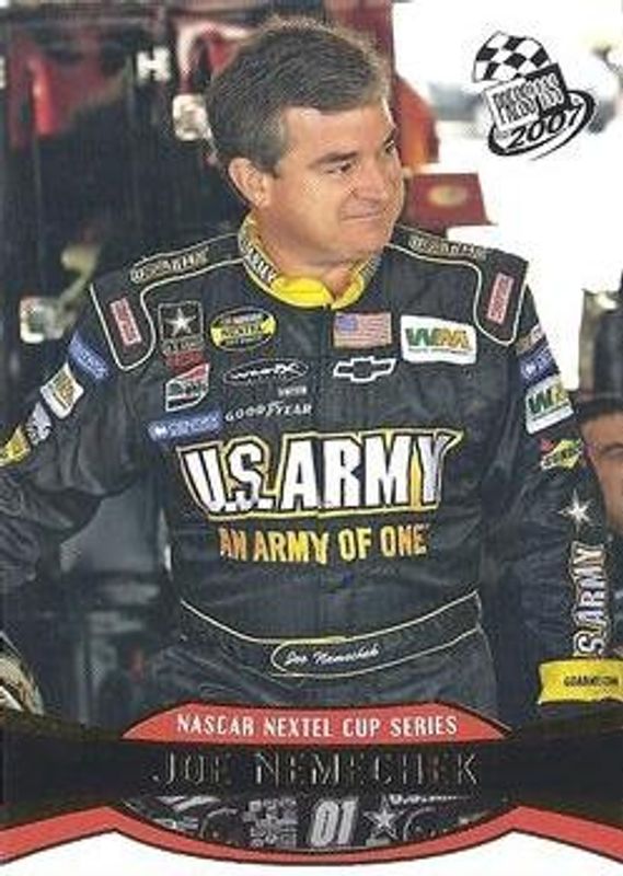 The Joe Nemechek 2007 Press Pass #G29 Gold card is 1 of 15 Joe Nemechek's card variations in the 2007 Press Pass set being tracked by Sports Card Investor, including Base, Blue, Platinum /100, eBay Previews /5, and Autographs.