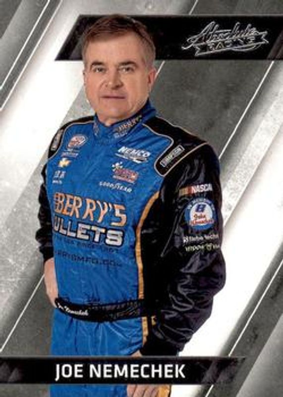 The Joe Nemechek 2017 Absolute NASCAR #29 Base card is 1 of 14 Joe Nemechek's card variations in the 2017 Absolute NASCAR set being tracked by Sports Card Investor, including Spectrum Silver /299, Spectrum Blue /199, Spectrum Red /99, Spectrum Gold /25, and Printing Plates Black /1.