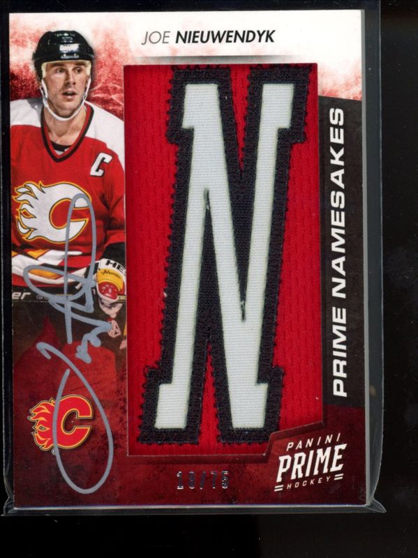 The Joe Nieuwendyk 2013 Prime #NA-JN Prime Namesakes Autographs /75 card is 1 of 5 Joe Nieuwendyk's card variations in the 2013 Prime set being tracked by Sports Card Investor, including #PS-JN Prime Skates /50, #GM-44 Genuine Marks /8, #GM-JN Genuine Marks /8, and #PS-JN Prime Skates Extreme /1.