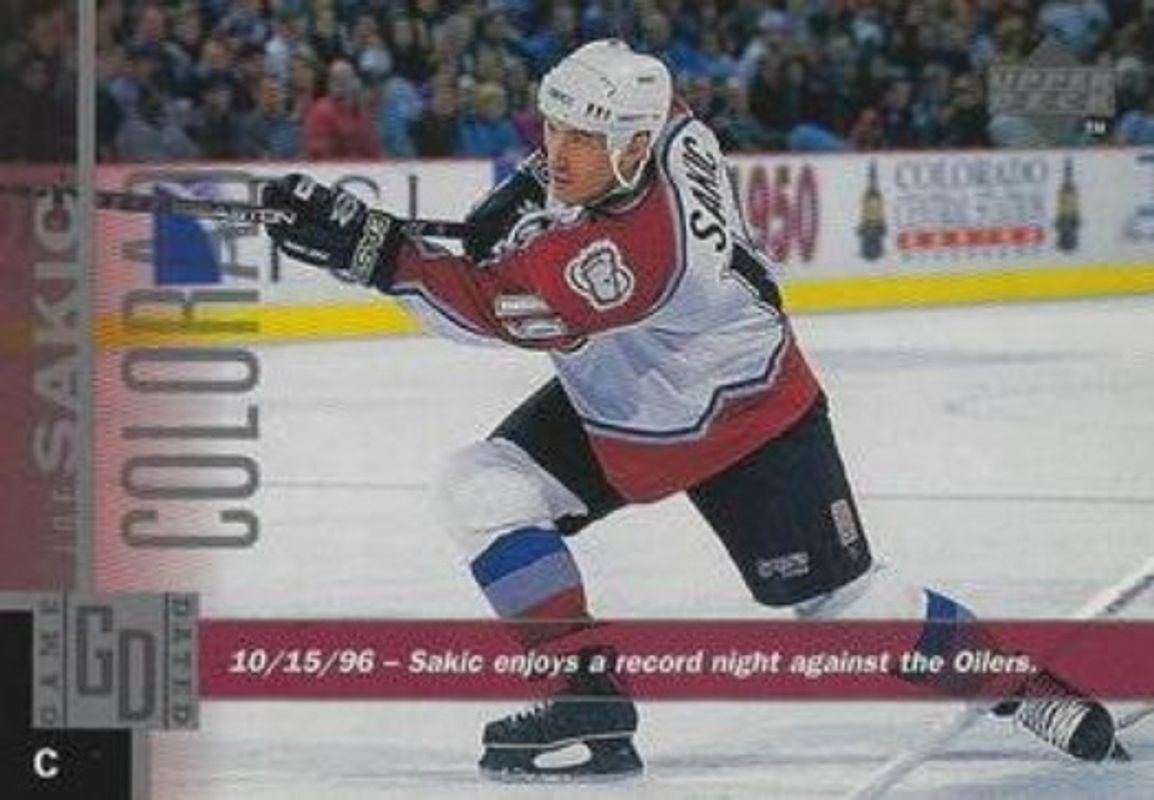 The Joe Sakic 1997 Upper Deck #3 Series Two Jumbo card is 1 of 11 Joe Sakic's card variations in the 1997 Upper Deck set being tracked by Sports Card Investor, including Base, Game Dated, Box Toppers, Game Jerseys, and Smooth Grooves.