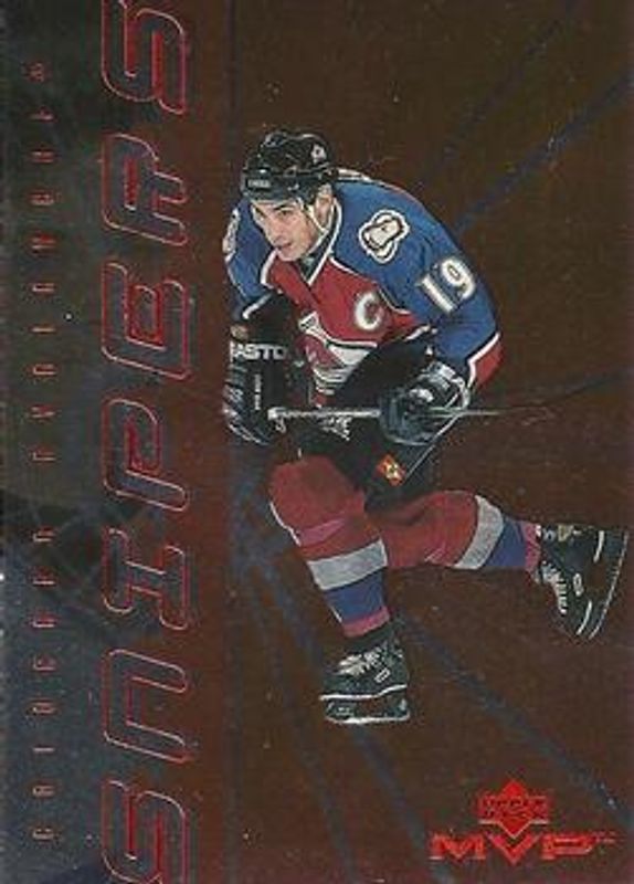 The Joe Sakic 1998 Upper Deck MVP #S10 Snipers card is 1 of 7 Joe Sakic's card variations in the 1998 Upper Deck MVP set being tracked by Sports Card Investor, including Base, Silver Script, Gold Script /100, Super Script /25, and OT Heroes.