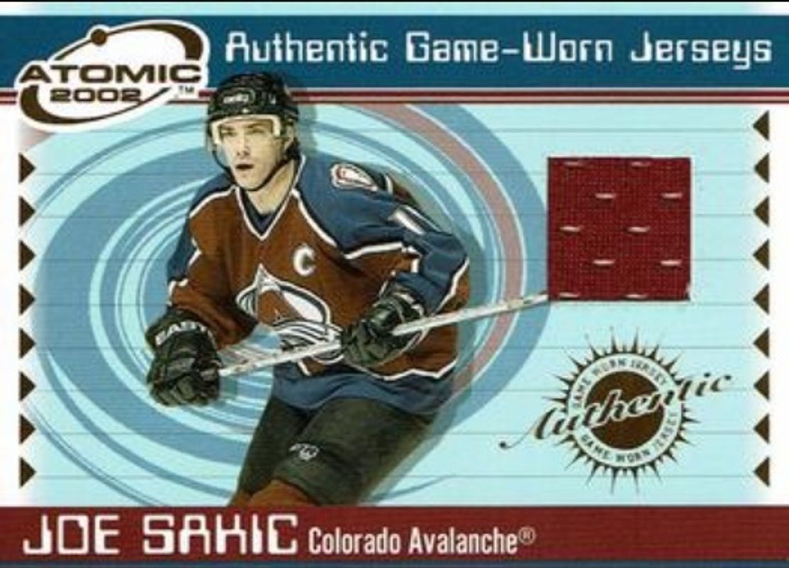 The Joe Sakic 2001 Pacific Atomic #14 Jerseys card is 1 of 10 Joe Sakic's card variations in the 2001 Pacific Atomic set being tracked by Sports Card Investor, including Base /500, Red /290, Gold /200, Premiere Date /90, and Blue /9.