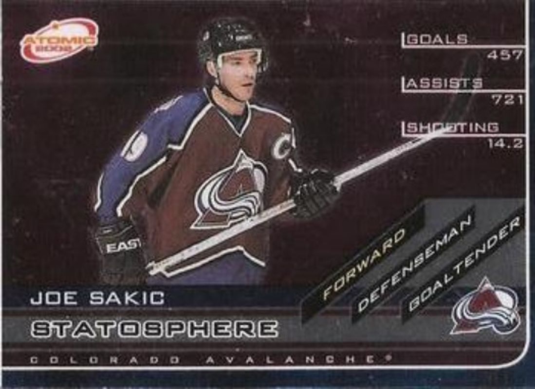 The Joe Sakic 2001 Pacific Atomic #12 Statosphere card is 1 of 10 Joe Sakic's card variations in the 2001 Pacific Atomic set being tracked by Sports Card Investor, including Base /500, Red /290, Gold /200, Premiere Date /90, and Blue /9.