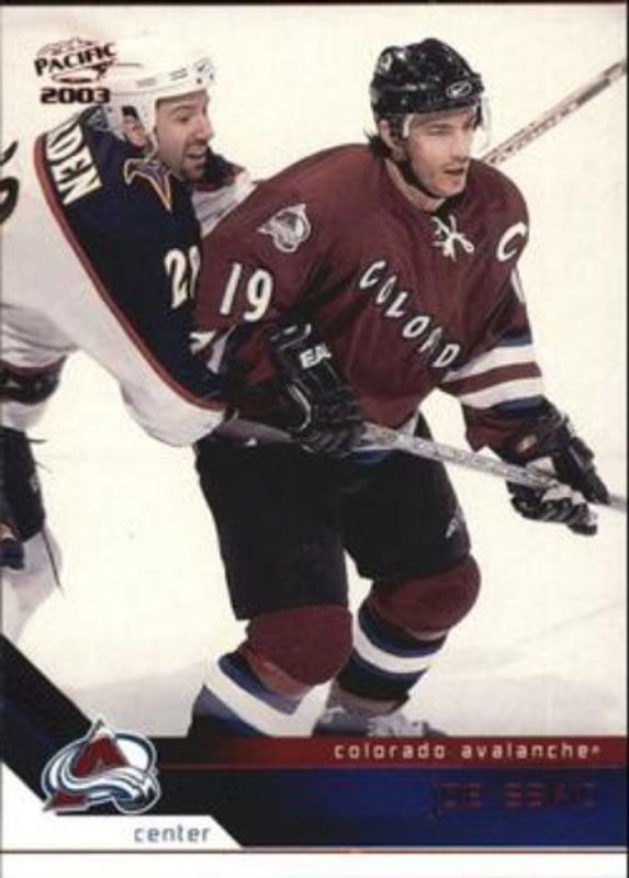 The Joe Sakic 2002 Pacific #96 Red card is 1 of 11 Joe Sakic's card variations in the 2002 Pacific set being tracked by Sports Card Investor, including Base /999, Blue /45, Nights SE /10, Impact Zone, and Jerseys.