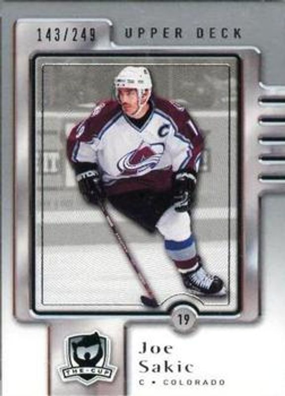 The Joe Sakic 2006 Upper Deck The Cup #22 Base /249 card is 1 of 11 Joe Sakic's card variations in the 2006 Upper Deck The Cup set being tracked by Sports Card Investor, including Gold /25, Black Rainbow /1, Printing Plates Black /1, Printing Plates Cyan /1, and Printing Plates Magenta /1.