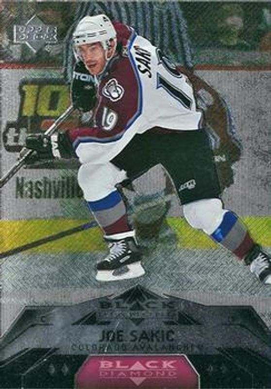 The Joe Sakic 2007 Upper Deck Black Diamond #174 Base card is 1 of 9 Joe Sakic's card variations in the 2007 Upper Deck Black Diamond set being tracked by Sports Card Investor, including Ruby /100, Gold /10, Platinum /1, Jerseys, and Run for the Cup.