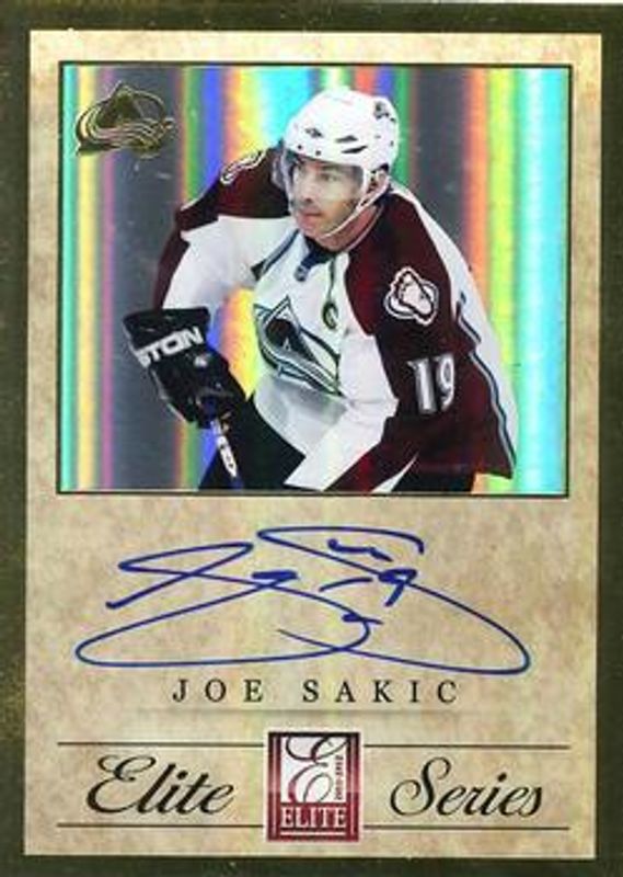 The Joe Sakic 2011 Elite #1 Elite Series Autographs /50 card is 1 of 10 Joe Sakic's card variations in the 2011 Elite set being tracked by Sports Card Investor, including #6 Elite Series Joe Sakic, #1 Elite Series Joe Sakic, #2 Elite Series Joe Sakic, #3 Elite Series Joe Sakic, and #4 Elite Series Joe Sakic.
