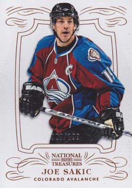 The Joe Sakic 2013 National Treasures #60 Base /99 card is 1 of 53 Joe Sakic's card variations in the 2013 National Treasures set being tracked by Sports Card Investor, including Gold /25, Silver /25, Emerald /5, Black /1, and Printing Plates Black /1.