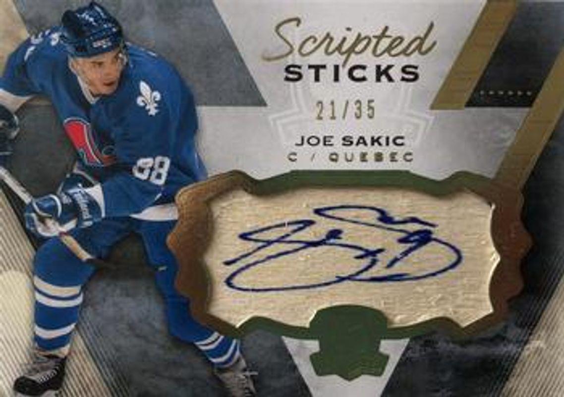 The Joe Sakic 2013 Upper Deck The Cup #SS-JS Scripted Sticks /35 card is 1 of 25 Joe Sakic's card variations in the 2013 Upper Deck The Cup set being tracked by Sports Card Investor, including Base /249, Gold Rainbow /25, Gold /14, Black Laundry Tags /3, and Black /1.