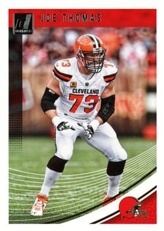 The Joe Thomas 2018 Donruss #71 Base card is 1 of 19 Joe Thomas' card variations in the 2018 Donruss set being tracked by Sports Card Investor, including Aqueous Test, Jersey Number, Press Proof Blue, Press Proof Bronze, and Press Proof Green.