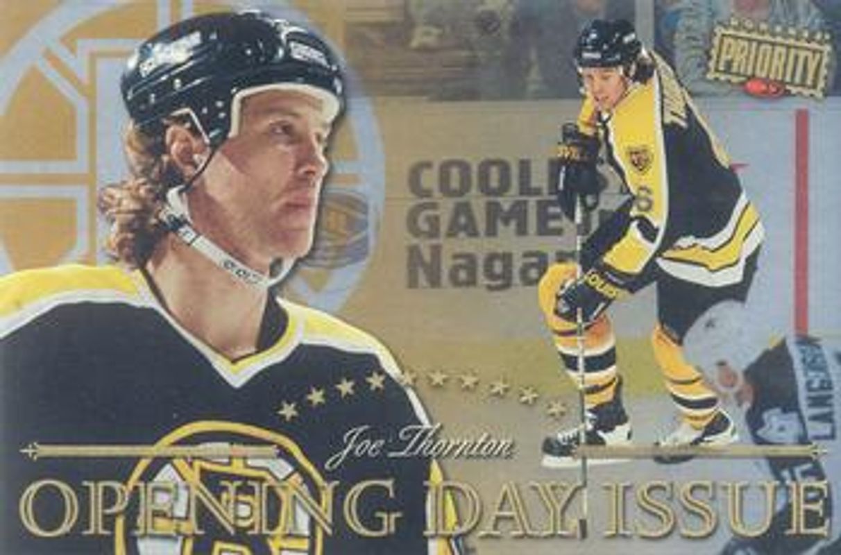The Joe Thornton 1997 Donruss Priority #28 Postcards Opening Day Issues card is 1 of 14 Joe Thornton's card variations in the 1997 Donruss Priority set being tracked by Sports Card Investor, including #173 Base, #207 Base, #215 Base, #25 Direct Deposit Promos, and #215 Stamp of Approval /100.