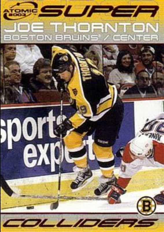 The Joe Thornton 2002 Pacific Atomic #2 Super Colliders card is 1 of 7 Joe Thornton's card variations in the 2002 Pacific Atomic set being tracked by Sports Card Investor, including Base /1300, Hobby Parallel /775, Blue /175, Red /125, and Gold /99.