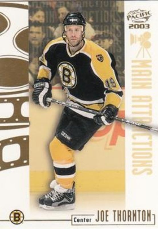 The Joe Thornton 2002 Pacific #3 Main Attractions card is 1 of 13 Joe Thornton's card variations in the 2002 Pacific set being tracked by Sports Card Investor, including Base /999, Red, Blue /45, Nights SE /10, and Impact Zone.