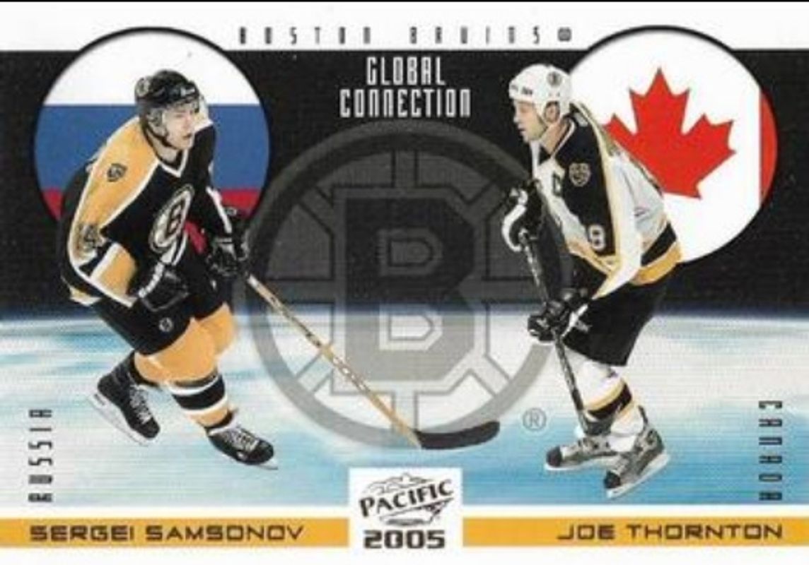 The Joe Thornton 2004 Pacific #2 Global Connection card is 1 of 8 Joe Thornton's card variations in the 2004 Pacific set being tracked by Sports Card Investor, including Base, Red, Blue /250, All Stars, and Jerseys /850.