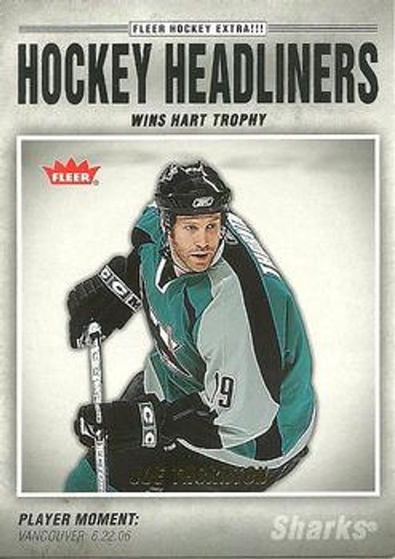 The Joe Thornton 2006 Fleer #HL7 Hockey Headliners card is 1 of 5 Joe Thornton's card variations in the 2006 Fleer set being tracked by Sports Card Investor, including Fabricology, Oversized, Signing Day, and Total O.