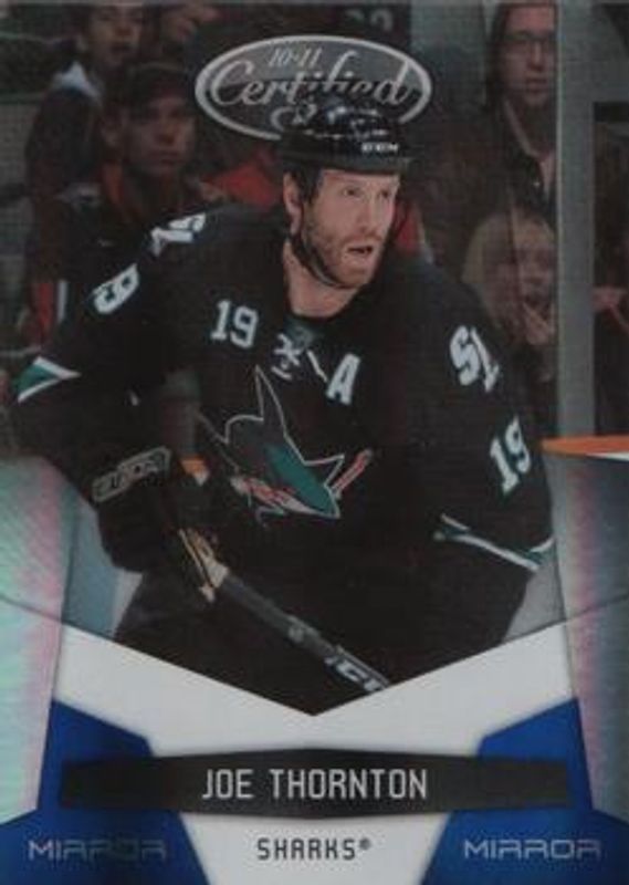 The Joe Thornton 2010 Certified #121 Mirror Blue /50 card is 1 of 27 Joe Thornton's card variations in the 2010 Certified set being tracked by Sports Card Investor, including Base /799, Platinum Red /999, Platinum Blue /250, Mirror Red /100, and Mirror Gold /25.